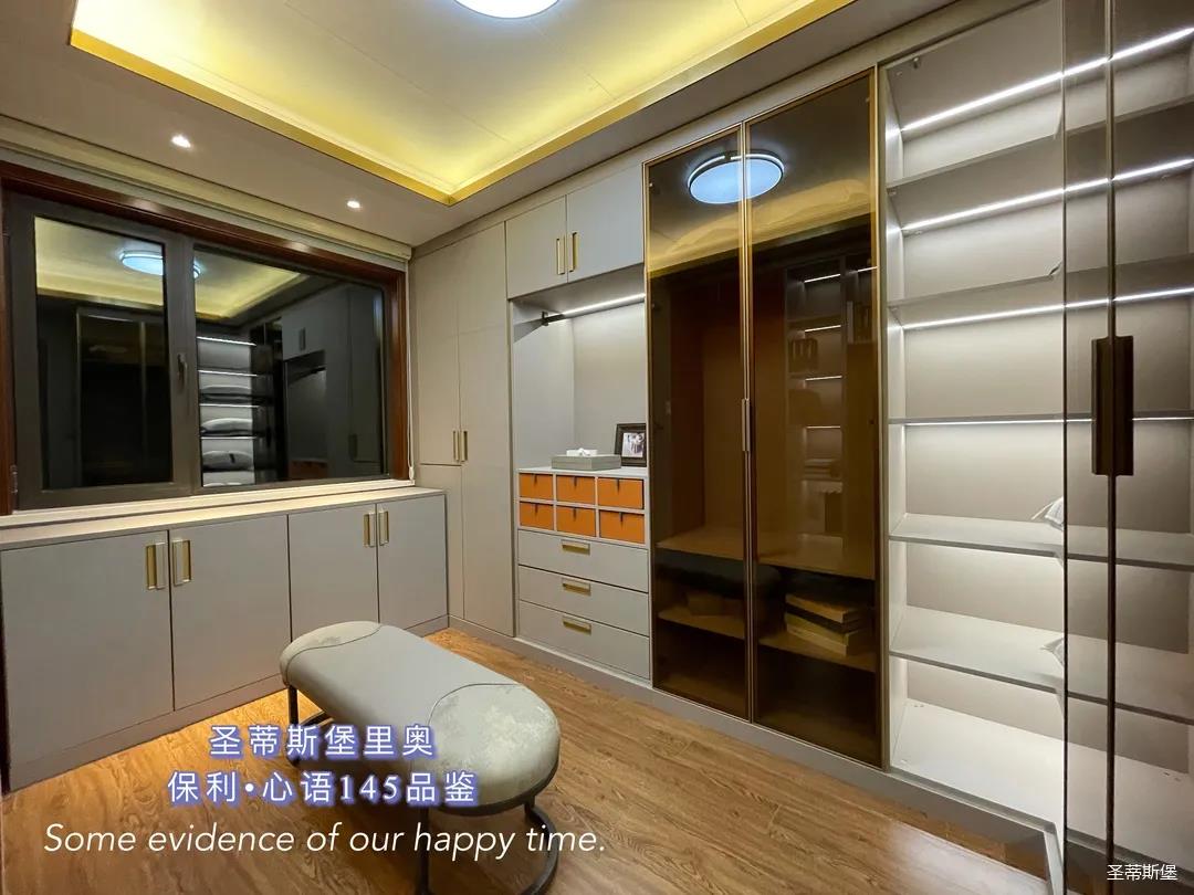 ▲衣帽间是用一间房改造的,衣柜开放式的布局处理,不但释放了空间的狭隘,也营造出了具有观赏性的空间格局,浅灰色调打造柜体基底,凝练出现代简约的生活质感。柜体中安装感应灯带,光线流泻其中,衬托出材质的自然肌理,温润细致的实木与刚硬冷冽的低奢金属相互交织出一个极具质感的储物空间。